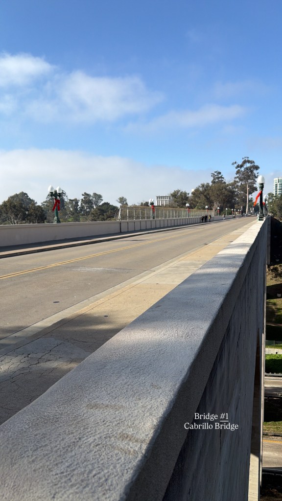 Park near the San Diego Natural History Museum and begin walking west through Balboa Park toward the iconic Cabrillo Bridge. You’ll pass palm-lined paths, museums, and gardens before stepping onto your first bridge of the day.